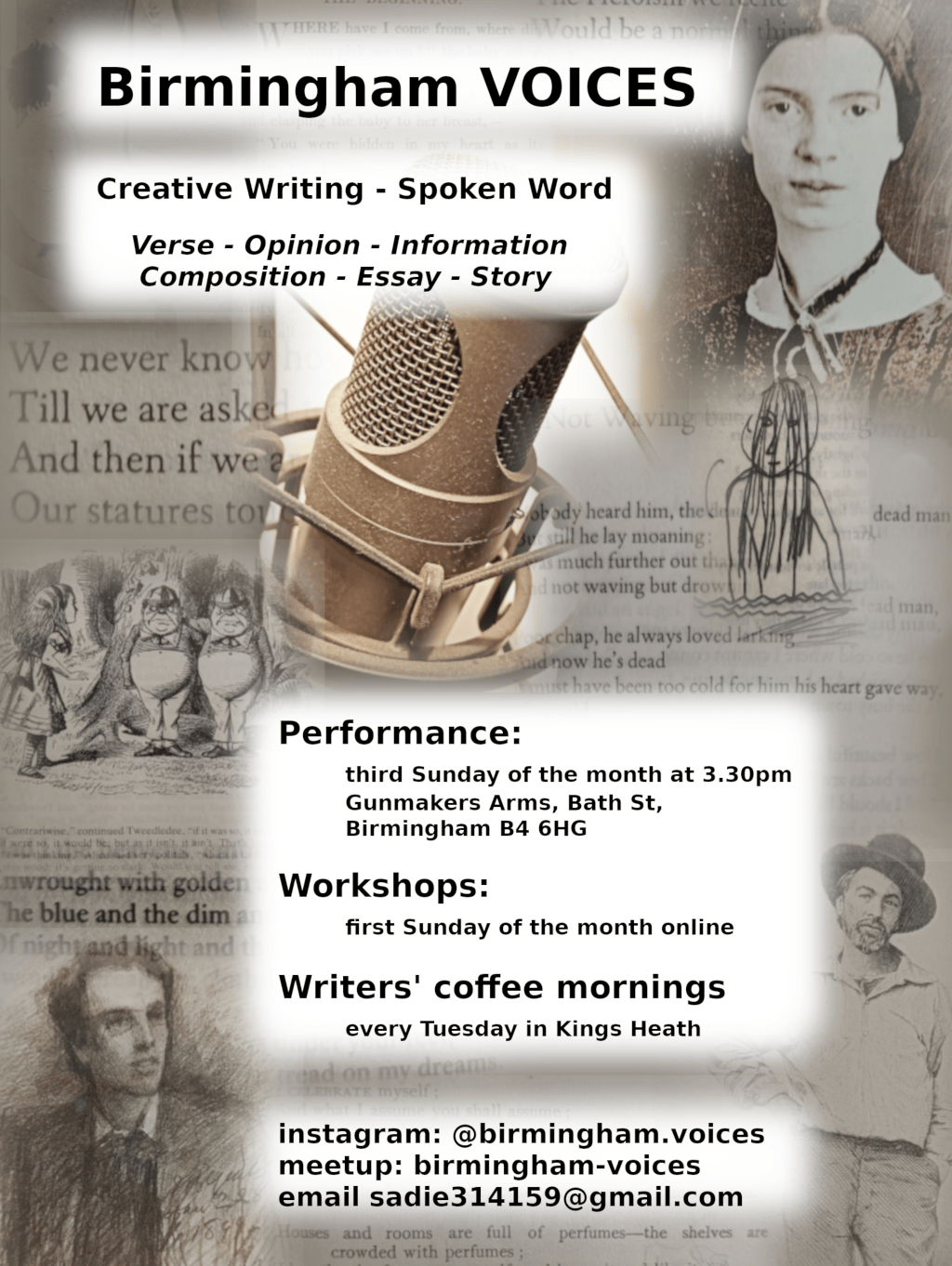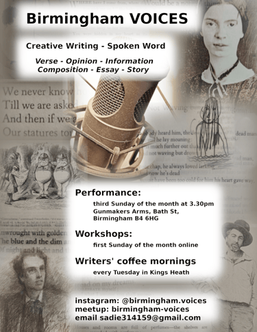 Birmingham VOICES is a group of writers, meeting regularly every third Sunday of the month at the Gunmakers Arms, B4 6HG, at 3.30pm to perform their work. We like to hear all kinds of spoken word: poetry, prose, stories, journalism, essay, stand-up and anything else written and spoken that I haven't thought of here. We also encourage performances of work that's not yours if it is special to you. Performance slots can be 5 minutes, or longer - please discuss with me if you need longer.