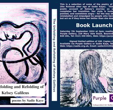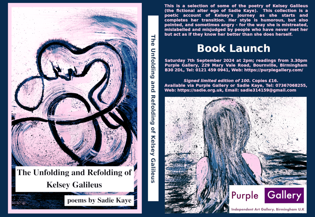 Book Launch: The unfolding and refolding of Kelsey Galileus (by Sadie Kaye). Purple Gallery, Bournville, 7th Sep 2024, 2.30.pm, Readings from 3.30pm.